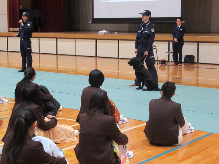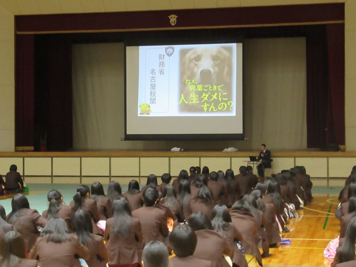 3年生を対象に、財務省名古屋税関の方を講師にお招きし、薬物乱用防止教室を実施しました。講話では、薬物乱用とは何か、不正薬物の種類やその危険性、薬物依存の恐ろしさなどについて、写真や動画を用いて分かりやすく説明していただきました。また、税関における薬物検査の実際についても紹介があり、生徒たちは高い関心をもって聞き入っていました。さらに、税関で活躍する麻薬探知犬による実演も行われ、実際の活動の様子を間近で見ることができ、生徒たちにとって非常に貴重な体験となりました。今回の教室を通して、生徒たちは薬物が身近な問題であることを改めて認識し、正しい知識を持って自らを守ることの大切さを学ぶことができました。