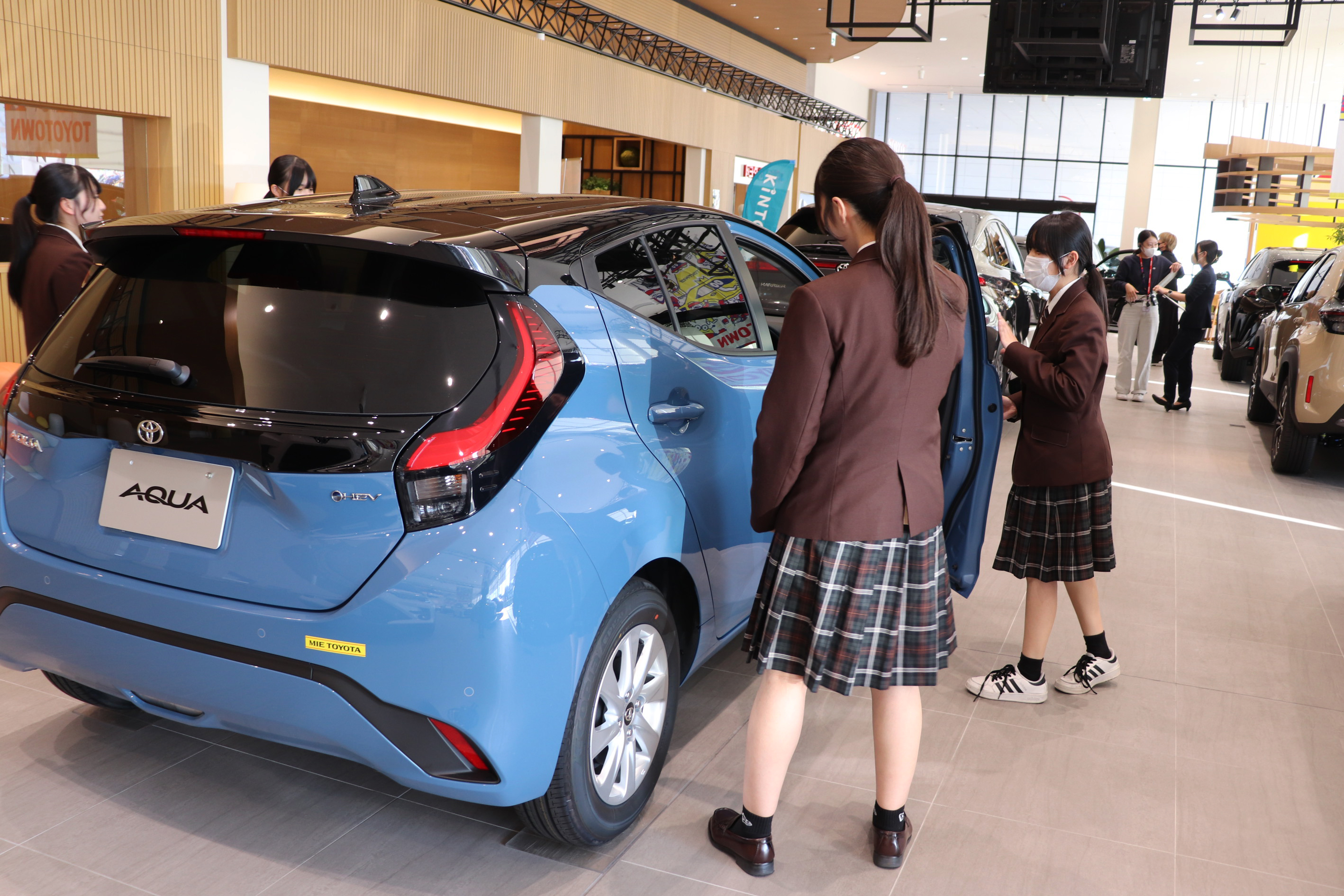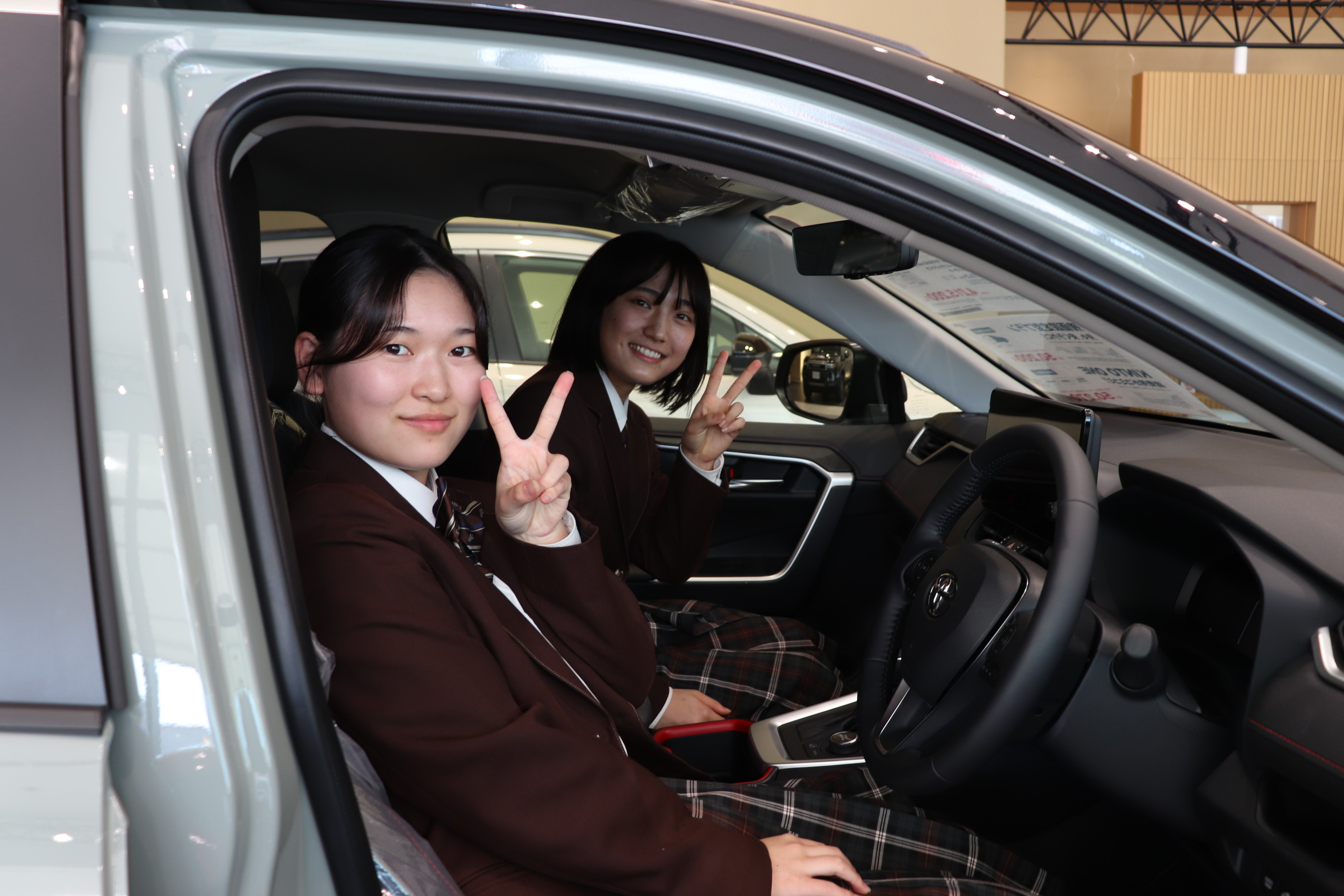 11月7日(木)、四日市市にある自動車販売店【トヨタウン四日市店】さんへ見学に伺いました。約20台の展示車を見せていただき、それぞれの車の特徴や、車を選ぶ際のポイントについて分かりやすく説明していただきました。実際に運転席に座り、ハンドルを握ったときの目線の高さやシートの座り心地など、車ごとの感覚的な違いを体験することもできました。